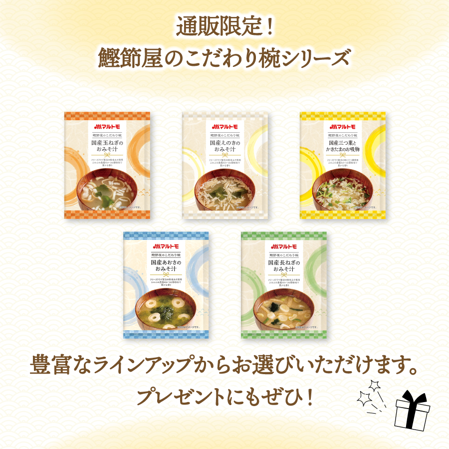 | 老舗鰹節屋がだしにこだわった通販限定のおみそ汁・お吸物5種を10個セット(50食)で販売中! |