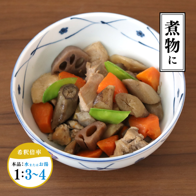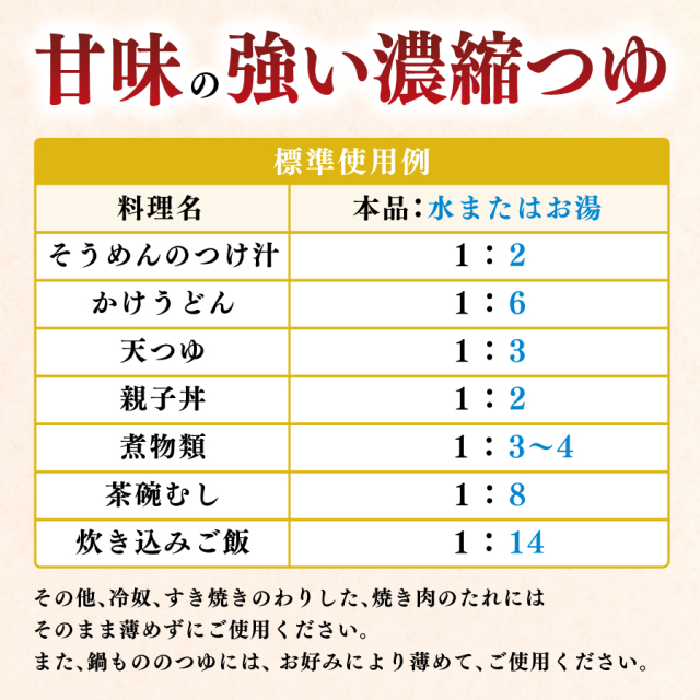 ●そうめんのつけ汁(1:2) ●かけうどん(1:6) ●天つゆ(1:3) ●親子丼(1:2) ●煮物類(1:3〜4) ●茶椀むし(1:8) ●おでん(1:14) |