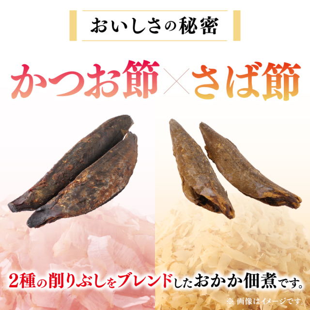 | さば削りぶし、かつお削りぶしを使用しジューシーに仕上げた佃煮です。 |