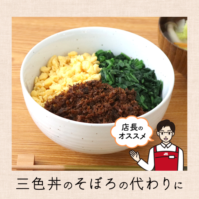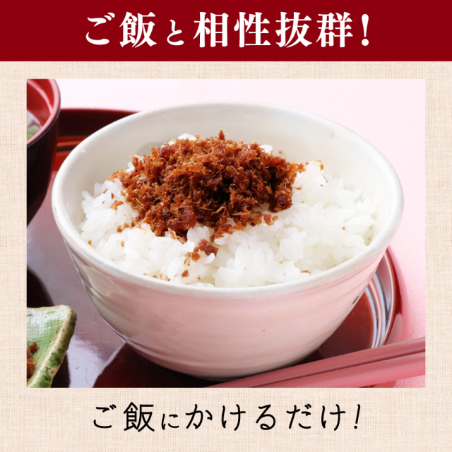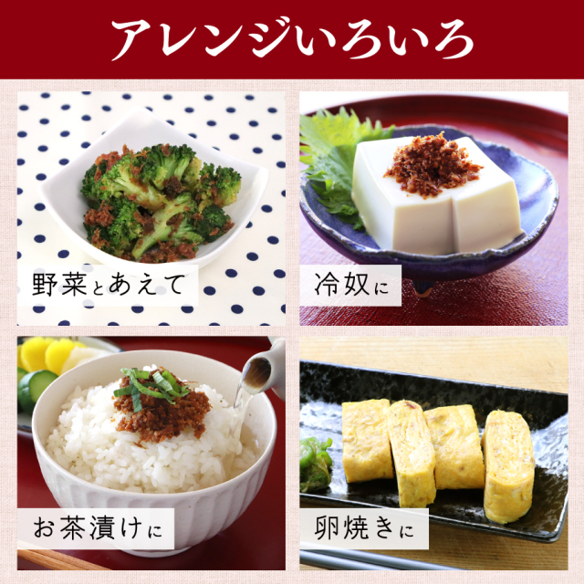 | ●新鮮な削りぶしを使用し、素材の味・香り・色沢を残した味付け、加工を行っております。 ●おにぎりの具材、ふりかけとしてお使いください。 ●ゆで野菜等とあえて、一品料理にも! ●まとめ買い、送料無料でお得です! |
