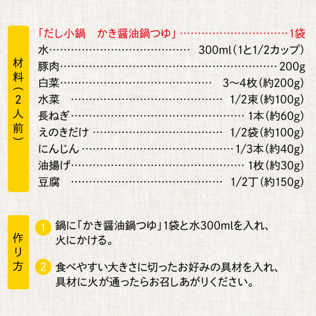 | 1、鍋に本品1袋と水300mlを入れ、火にかける。 2、食べやすい大きさに切ったお好みの具材を入れ、具材に火が通ったらお召し上がりください。 |