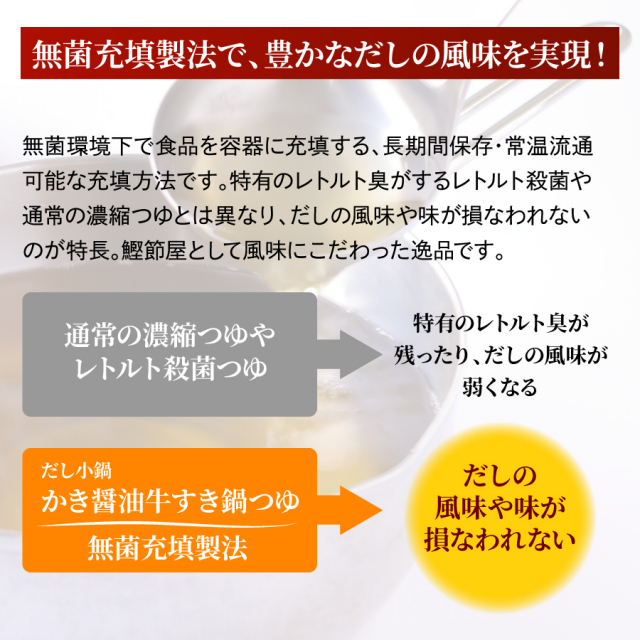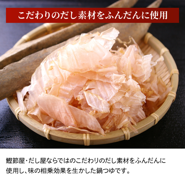 | このだし感、半端ない! 鰹節屋ならではの味の相乗効果を生かした鍋つゆ。 食べたいときに、人数分がおいしく食べられる小袋包装。 風味を保つ無菌充填製法です。 |
