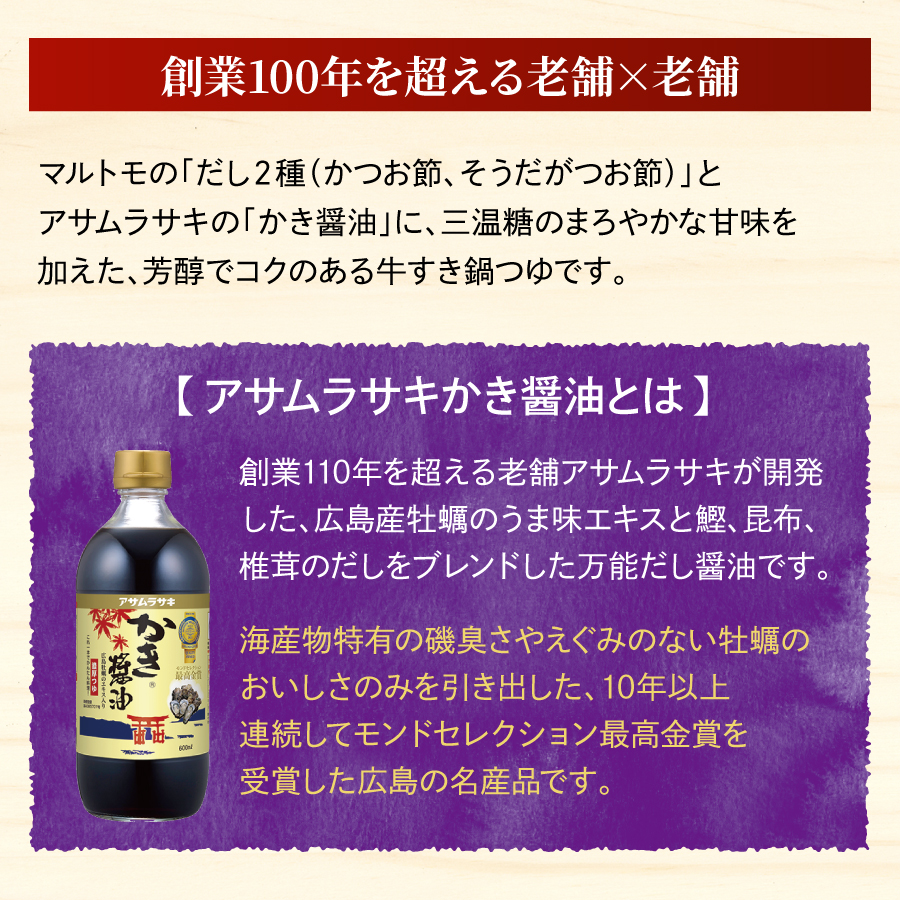 | しょうゆ加工品(かき醤油)(国内製造)、砂糖、たん白加水分解物、かつおだし、かつお節エキス、清酒、かつお節、そうだがつお節、昆布エキス、食塩、和牛エキス/調味料(アミノ酸等)、増粘剤(キサンタン)、甘味料(ステビア)、(一部に小麦・大豆・牛肉を含む) |