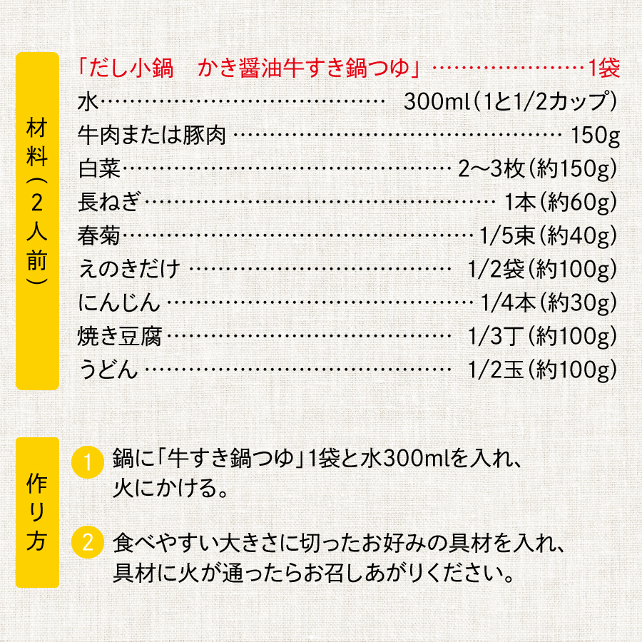 | 1、鍋に本品1袋と水300mlを入れ、火にかける。 2、食べやすい大きさに切ったお好みの具材を入れ、具材に火が通ったらお召し上がりください。 |