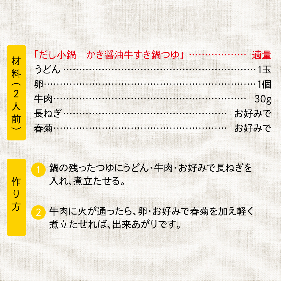 | 鍋つゆ / なべつゆ / 天つゆ / 丼もの / 出汁 / 煮物 / すきやき / すき焼き |