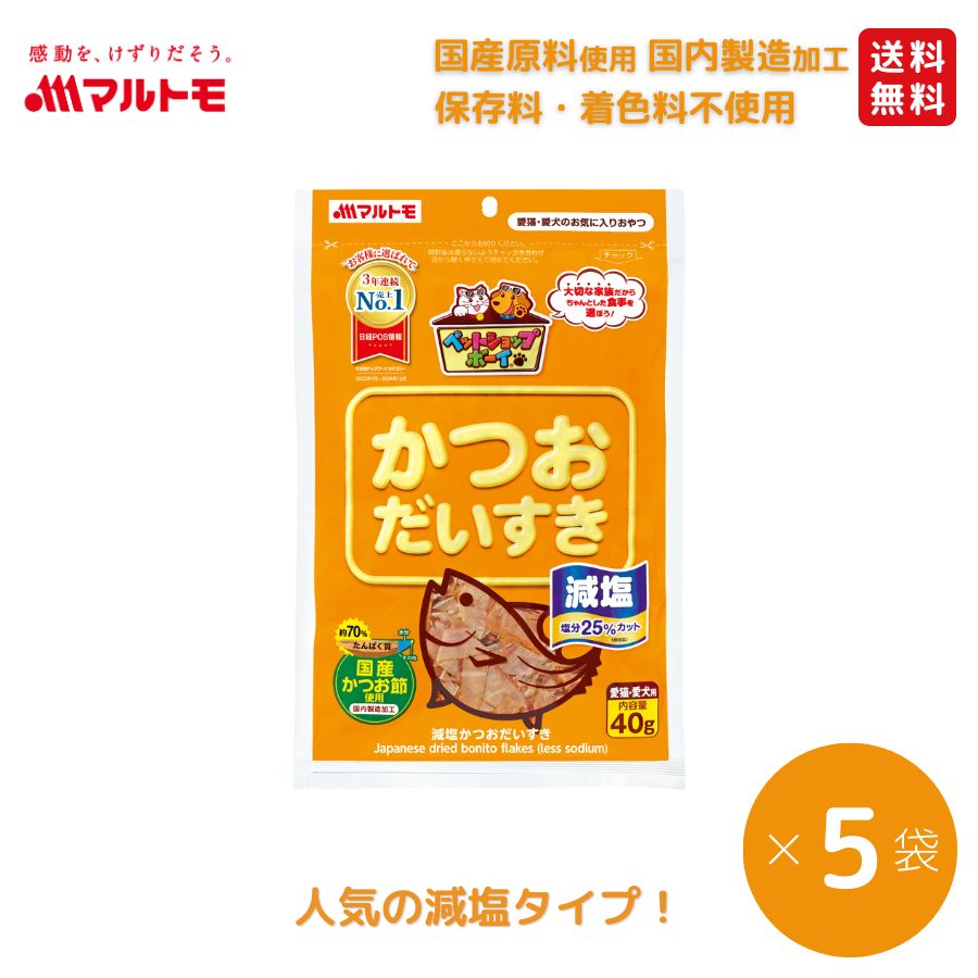 | ●国産のかつお節を100%使用したおやつです。 ●塩分は、当社一般品に比べ約25%カット(塩分0.9%以下)しているので、塩分が気になるペットに最適です。 ●薄くスライスしていますので食べやすく、おやつに最適です。 ●ドライタイプ・ウェットタイプのペットフード等へのふりかけ用としてもお与えいただけます。 ●国内製造加工で、保存料・着色料は一切使用していません。 ●5袋まとめ買い、送料無料です! |
