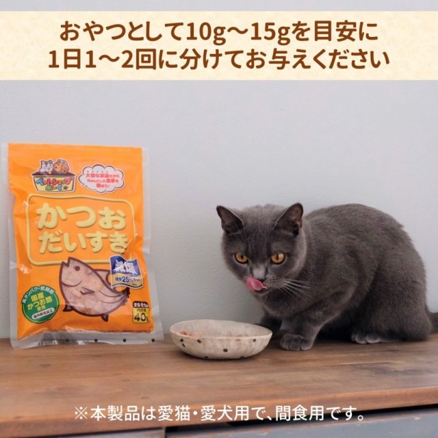 | ペットの健康状態、年齢、運動量を考慮した上でおやつとして10g〜15gを目安に1日1〜2回に分けてお与えください。 |