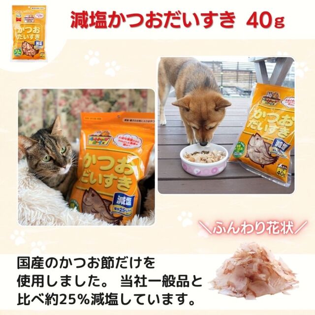 | ●国産のかつお節を100%使用したおやつです。 ●塩分は、当社一般品に比べ約25%カット(塩分0.9%以下)しているので、塩分が気になるペットに最適です。 ●薄くスライスしていますので食べやすく、おやつに最適です。 ●ドライタイプ・ウェットタイプのペットフード等へのふりかけ用としてもお与えいただけます。 ●保存料・着色料は一切使用していません。 |
