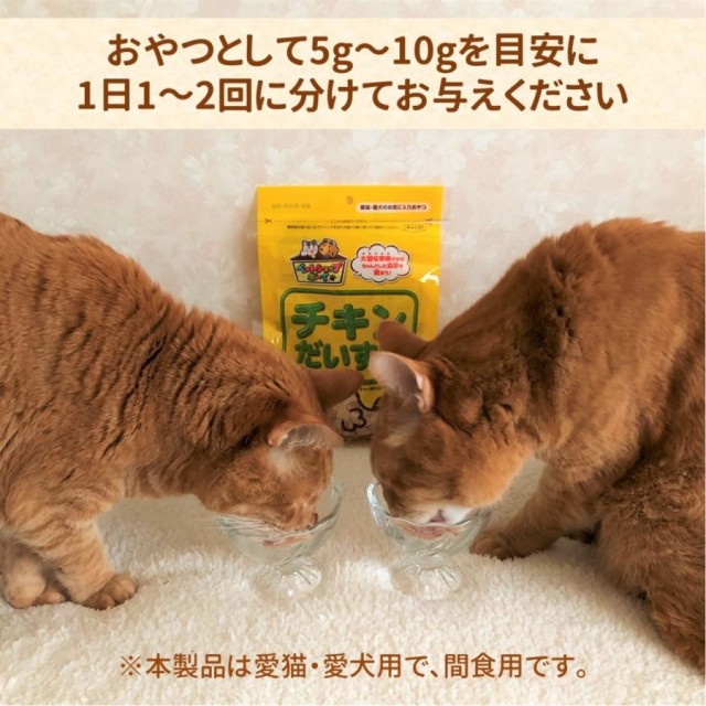 | ペットの健康状態、年齢、運動量を考慮した上でおやつとして5g〜10gを目安に1日1〜2回に分けてお与えください。 |