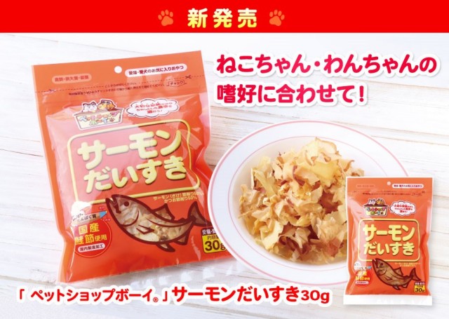 | ●国産の鮭節とかつお節を使用しました。 ●かつおに並んで高たんぱくとされる鮭をブレンドし、鮭とかつおの栄養が一度に摂れるおやつです。 ●「だいすき」シリーズは、国産原料使用・国内加工、保存料・着色料不使用の安心・安全な、たんぱく質(約70%)を含むペット用おやつです。 ●そのまま与える以外にも、ペットフード(ドライ・ウェットタイプ)のふりかけ用としていつもの食事をさらにおいしくします。 ●ねこちゃん・わんちゃんが食べやすい形状を追求し、花の大きな薄削りにしました。ふんわり、ボリュームのある花けずりです。 |