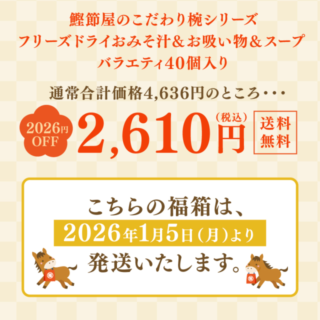 | 2026年マルトモのお得な福箱「おみそ汁・お吸い物・スープ9種40個セット」を販売! |
