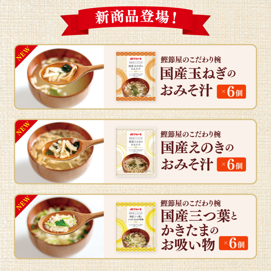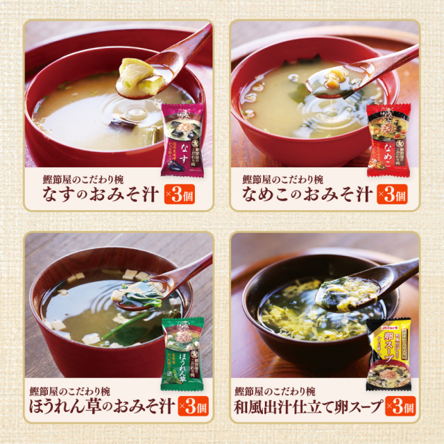 | 【セット内容】 1、【新商品】国産玉ねぎのおみそ汁(×6個) 2、【新商品】国産えのきのおみそ汁(×6個) 3、【新商品】国産三つ葉とかきたまのお吸い物(×6個) 4、国産あおさのおみそ汁(×5個) 5、国産長ねぎのおみそ汁(×5個) 6、なすのおみそ汁(×3個) 7、なめこのおみそ汁(×3個) 8、ほうれん草のおみそ汁(×3個) 9、和風仕立ての卵スープ(×3個) |